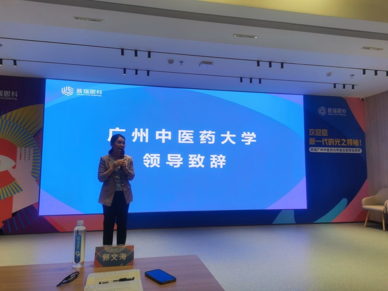 参观完成后,一行人来到8楼行政中心开展讲座交流。普瑞眼科集团副总裁、大湾区总经理刘中香致辞。广州中医药大学第一附属医院(第一临床医学院)郭文海副书记致辞,并认真地介绍了我校深厚的历史文化底蕴,出色的人才供给以及我校眼视光学专业的专业特色以及就业优势。随后普瑞眼科医院集团大湾区运营总监杨晓晴向我院师生详细地介绍了普瑞眼科从创办之初到如今的发展态势、医院主营业务、人才培养计划以及员工福利等等。我院2023届眼视光学专业毕业生郭美琰同学进行了入职普瑞眼科的经验分享。在她的口中,普瑞眼科是一个有耐心、有希望、有能量的眼科医院。普瑞眼科聂昊辉主任向我院师生详细介绍了眼科的主营业务、日常的工作内容、科研方向以及一些眼科相关的公益项目的开展,鼓励我院师生有机会积极入职普瑞,加入普瑞。