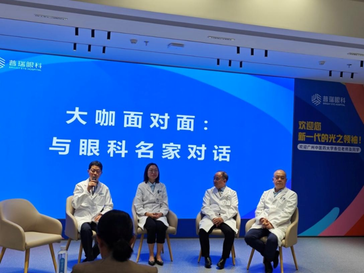 讲座最后,广州普瑞眼科医院业务副院长、白内障科主任杨为中;广州普瑞眼科医院眼底内科主任兼功能检查科主任罗光伟;番禺普瑞眼科医院视光与小儿眼病科主任聂昊辉;广州普瑞眼科医院视光及小儿眼科副主任林英与我院同学亲切对话,对我院师生在目前学习以及未来工作中的问题答疑解惑。