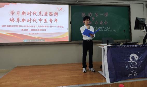 为充分发挥领导干部联系学生班级工作的育人功能,切实引领青年学生深入学习习近平总书记关于新质生产力的重要论述,激发同学们积极投身新时代中医药事业的热情,第一临床医学院于5月21日16时30分在我校三元里校区综教楼309举办了杨忠奇副院长联系2020级中医学八九年制班级“五个一”活动之“思政第一课”暨专题座谈会,活动以“学习新时代先进思想,培养新时代中医青年”为主题,班级辅导员池思晓老师及全体同学参加了本次活动。