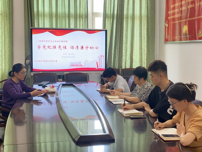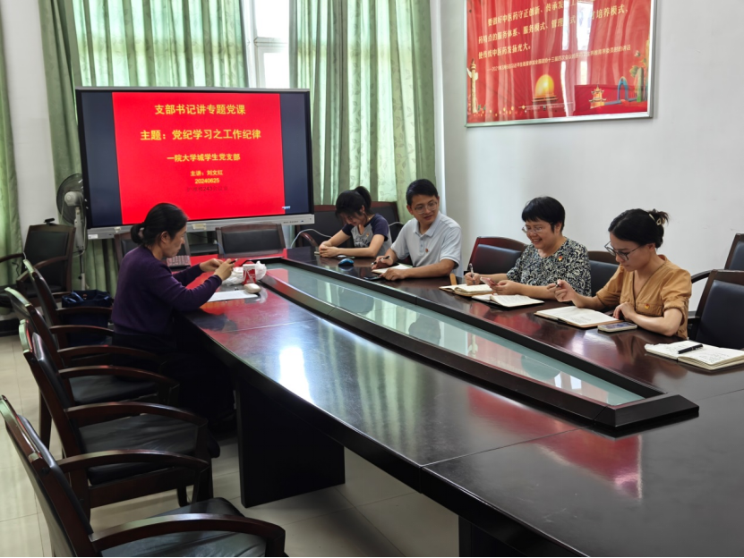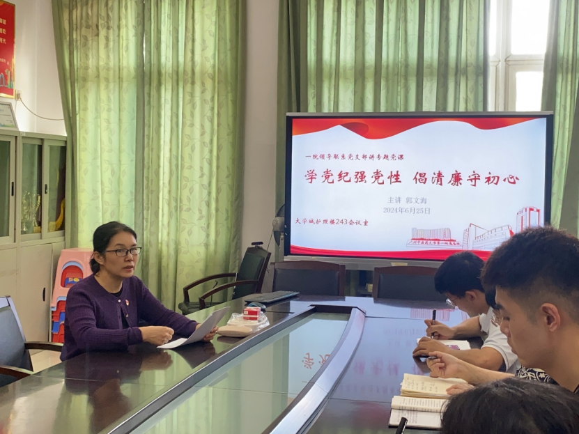 2024年6月25日上午,广州中医药大学第一临床医学院教学党总支大学城学生党支部在护理楼243召开专题纪律党课。第一临床医学院党委副书记郭文海、大学城学生党支部刘文红、陈小波、何诗诗和王珊参加了会议。