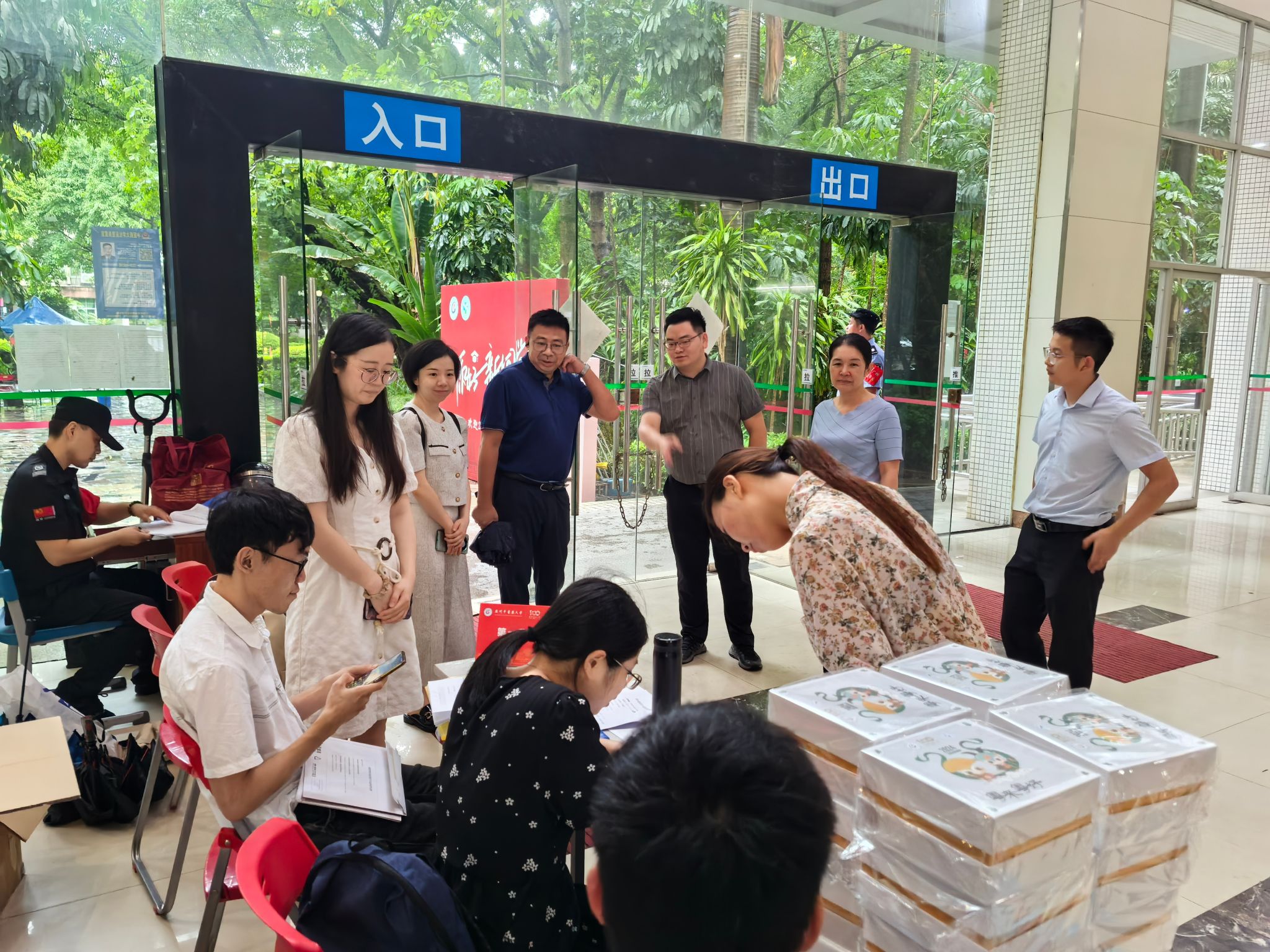 广州中医药大学研究生院副院长徐大量,第一临床医学院党委郭文海副书记,研究生院曾庆波科长、研究生院长助理陈莉老师,第一临床医学院学工办李肇宏主任,冒着大暴雨前往三元里校区报到现场慰问指导工作,对负责迎新的老师、班委、研会志愿者们的工作给予了充分的肯定与赞扬,叮嘱大家要用热情、细致、周到的服务,为新生们顺利入学做好各项保障工作,让新生们感受到第一临床医学院的贴心。