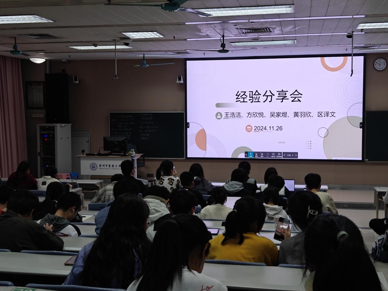 2024年11月26日晚19:00,广州中医药大学大学城校区综合楼201室举办了一场别开生面的保研实习经验交流会。此次活动由第一临床医学院学生工作办公室主办,旨在通过高年级优秀学生的经验分享,为低年级学生提供宝贵的保研与实习指导,进一步推动学院人才培养体系的完善与发展。