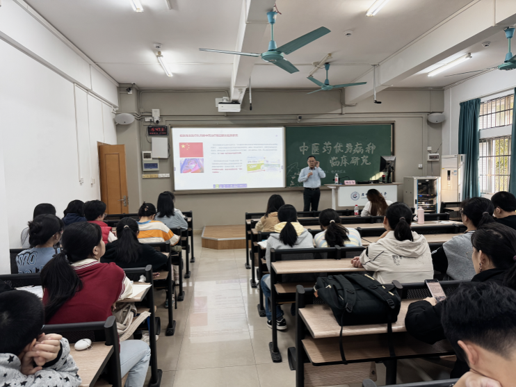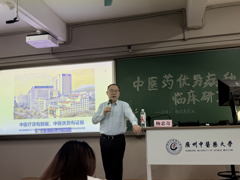 紧接着,杨院长详细介绍了中医药临床研究的情况,通过一系列生动的案例,展示了中医在特定病种治疗中的显著优势。他特别提到,2006年,我院开展国家多中心新药临床试验,是我国承接国际多中心新药临床试验最早、项目最多的中医院。中医“整体观念”和“辨证施治”的原则,在重症肌无力、股骨头坏死、抗击非典以及登革热疾病治疗中发挥了不可替代的作用。同时,杨院长也分享了个人及团队在中医临床研究中的最新成果,进一步增强了同学们对中医科学性的认识。