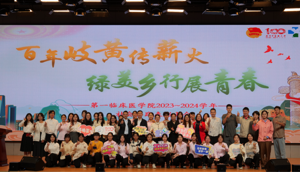 心系社会,以行践言。为表彰我院过去一年在社会实践活动中表现优秀的集体和个人,分享优秀社会实践成果,同时宣讲新一年的社会实践活动,鼓励我院学子积极参与三下乡,广州中医药大学第一临床医学院于12月1日在大学城校区国际会议厅举办了“百年岐黄传薪火,绿美乡行展青春”2023-2024学年社会实践表彰大会。一院党委副书记郭文海、一院教育教学部部长方熙茹、一院教育教学部副部长周峰、一院学工办负责人陈小波、一院学生团委书记黄婷、学工办老师等领导老师莅临大会现场,还有217名23、24级学生观众、86位队伍代表参与本次大会。