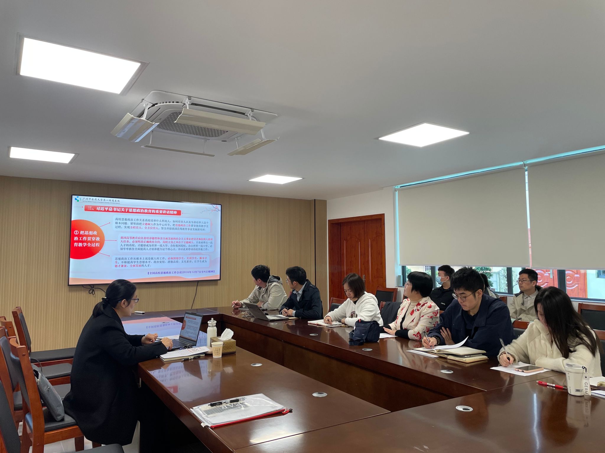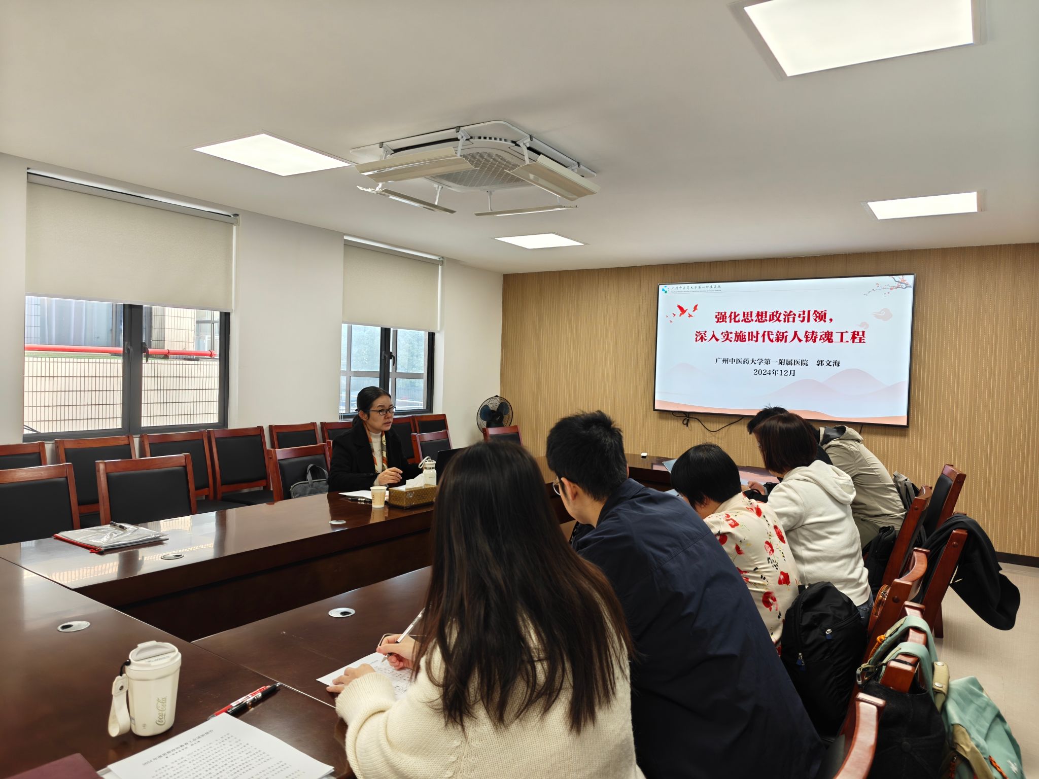 2024年12月27日,广州中医药大学第一附属医院党委郭文海副书记在第一临床医学院学工办专题理论学习会,为第一临床医学院辅导员和班主任带来了一场主题为“强化思政引领,深入实施时代新人铸魂工程”的精彩思政课。本次专题理论授课内容丰富,内涵深刻,为老师们带来了一场思想盛宴。