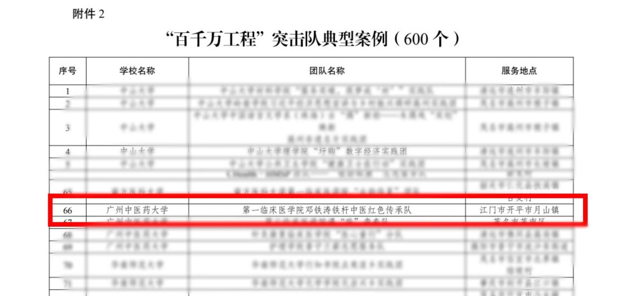 近日,团省委、省委宣传部、省文明办、省教育厅、省学联联合公布《2024 年广东大中专学生志愿者暑期文化科技卫生“三下乡”社会实践活动暨广东青年大学生“百千万工程”突击队行动品牌项目及典型案例名单》。我院邓铁涛铁杆中医红色传承队于邓老故乡江门市开平市月山镇开展的实践活动成功入选典型案例!