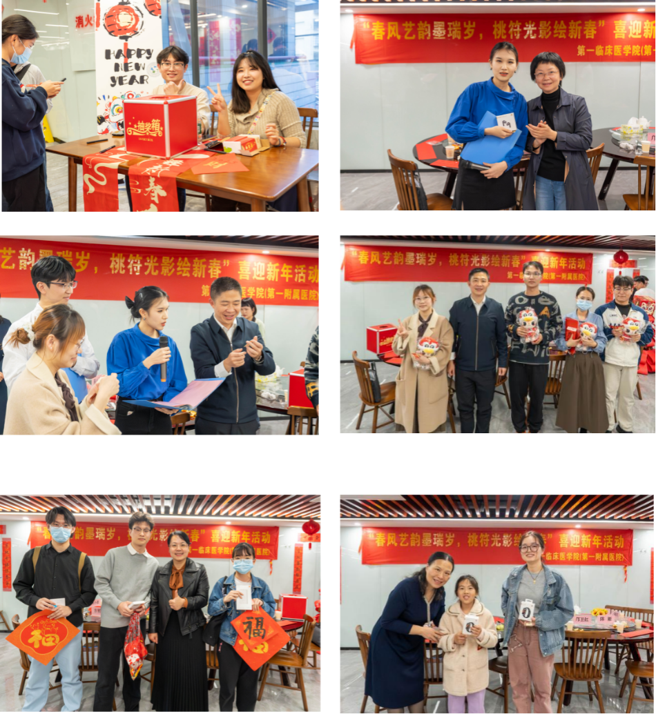 2025 年 1 月 24 日下午,广州中医药大学第一附属党委书记邝卫红、党委副书记郭文海、教学党总支书记陈雁、党委办公室主任方熙茹、教育教学部部长龙泳伶、副部长周峰、研究生办公室副主任申啸笑、学生工作办公室副主任陈小波、学生团委副书记黄婷等各位领导和老师亲临“春风艺韵墨瑞岁,桃符光影绘新春”新春游园会现场,与师生们共度佳节。会场中央的祝福树上挂满了写有新年愿望的卡片,寄托着师生们对健康、学业、前程的美好期盼。剪纸区中,师生们亲手剪出各种生动的图案,感受传统艺术的独特魅力;毛笔拓印区里,大家或挥毫泼墨书写对联斗方,或动手拓印祝福妙趣横生。乒乓投球区,大家认真瞄准、奋力投出,乒乓球在空中划过优美弧线,现场充满欢声笑语。套圈游戏时,参与者手持塑料圈,专注瞄准目标,轻轻抛出,套中奖品的瞬间,现场爆发出阵阵欢呼和掌声。