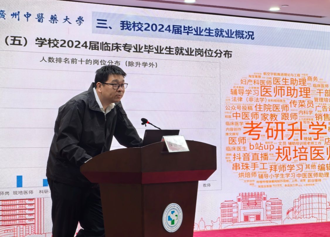 江门五邑中医院党委副书记李鹏飞分享了医院在人才培养与吸纳方面的经验,强调了医院对人才的重视以及为就业者提供的广阔发展空间。同时,李书记也针对当前医疗行业就业形势,为毕业生提供了实用的就业建议,鼓励大家在实践中积累经验,提升专业技能,积极投身医疗事业,为群众健康贡献力量。