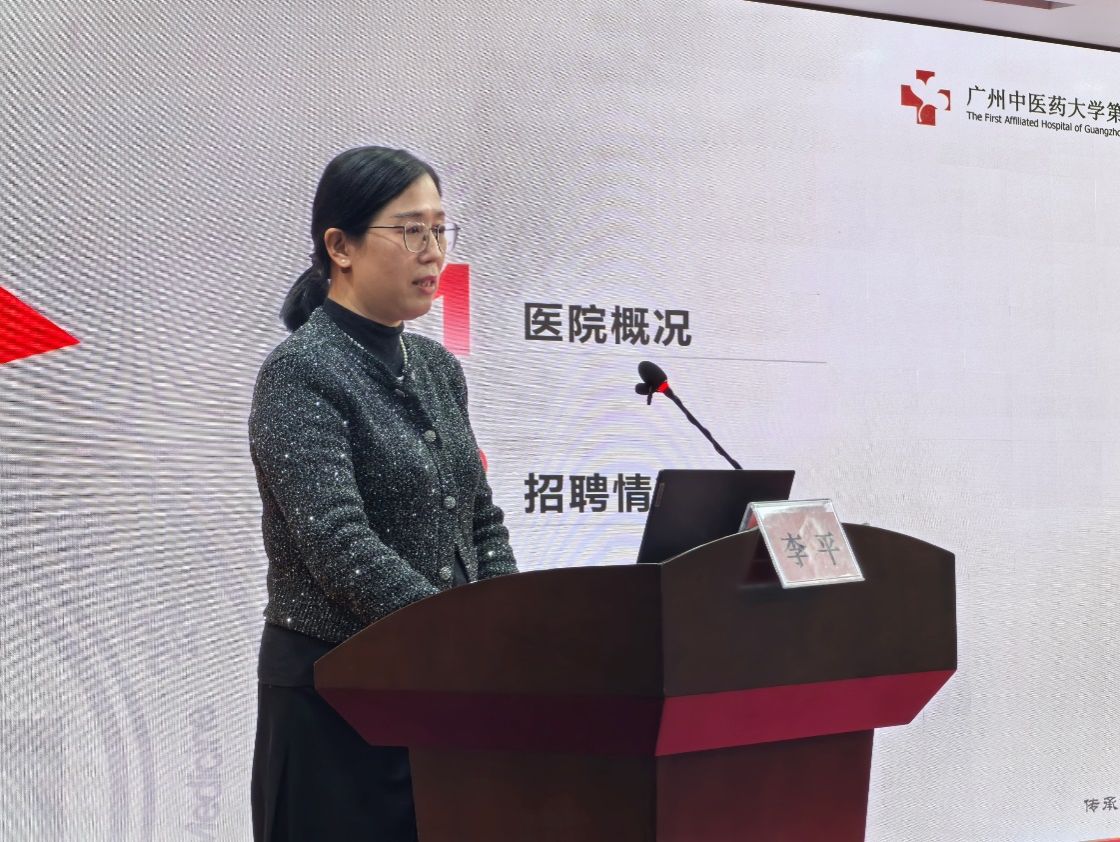 紧接着,广州中医药大学第一附属医院组织人事部部长李平,在会上就医院就业政策及规培政策进行了详细解读。李部长从医院概况出发,全面介绍了招聘情况及规培招生政策,为即将步入职场的学生提供了宝贵的就业指导和信息。此次讲解有助于学生更好地了解医院招聘动态,规划未来职业路径。