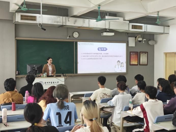 课程中,郭文海副书记多次提及青年医学生的时代责任,对标国家卫健委《医学人文关怀提升行动方案(2024-2027)》及广东省相关政策,鼓励学生以“医病、医身、医心”为目标,提升职业素养与创新能力。在场学生认真聆听、积极思考,一名学生课后表示:“郭书记的讲述让我更清楚未来的方向,不仅要精进医术,更要心怀仁爱。”