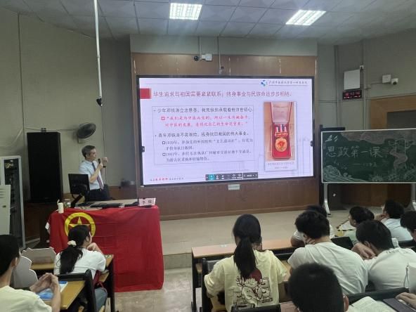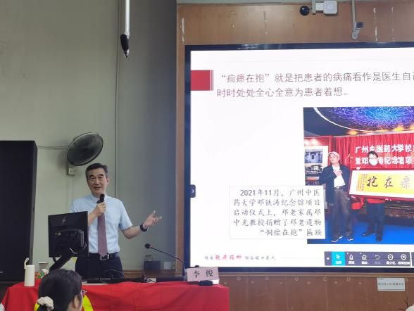 为深入学习贯彻习近平总书记关于学校思政课建设的重要精神指示,贯彻落实新时代学校思政课建设推进精神,2025年3月25日,广州中医药大学第一临床医学院(第一附属医院)党委副书记、院长李俊以“传承铁涛精神,做合格中医人”为题,在三元里校区办公楼第三大课室为2022级中医学五年制专业学生讲授思政第一课。教学党总支书记陈雁,纪检室主任王红艳,教育教学部部长龙泳伶,学工办副主任陈小波,刘文红老师以及2022级中医学五年制专业班级同学参加了本次授课。