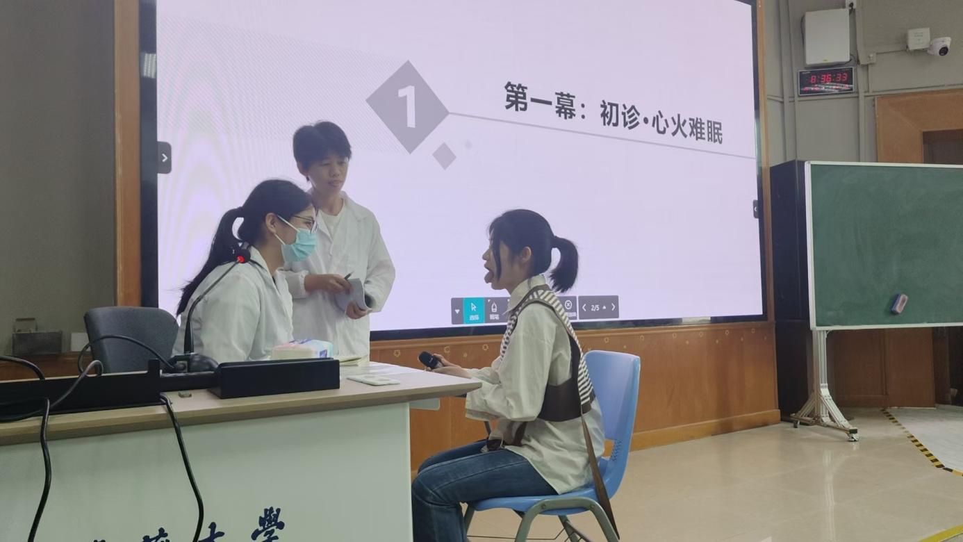 在本学期的教学进程中,第一临床医学院内科教研室积极探索《中医内科学》教学改革路径,于一院 22 中医(1、2 合班)的最后一堂课上,授课老师对教学内容和形式作了创新性探索。此次课程由课程负责老师黄习文提前组织策划,学生自由选题和组合,通过小组演绎将学习内容通过病案情景剧、小品以及相声等新颖方式进行串联和总结,引导同学们进行知识复习,为巩固《中医内科学》知识要点带来了全新视角。