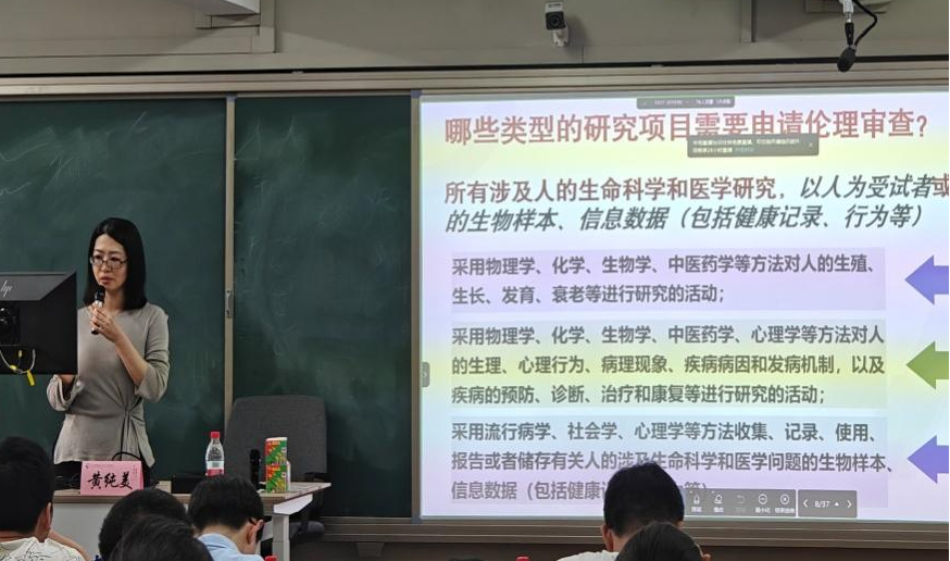 黄纯美老师则在“研究生医学研究伦理审查流程”培训中全流程解析伦理审查实操,一一破解“申报痛点”。她结合实例强调伦理审查是学位论文、科研项目及论文发表的必备前提;详解干预性试验、回顾性分析等研究类型,明确需提交研究方案、知情同意书、研究者资质证明等材料,并梳理初始审查、复审及跟踪审查等流程。黄老师重点解析“免费补偿、知情同意、隐私保护”原则,警示材料缺漏、毕业研究生提交截止时点、模板错误等问题,以“论文因伦理文件不足被撤稿”为例,指导知情同意书规范表述与数据隐私保护要点,助力研究生掌握全流程合规操作。