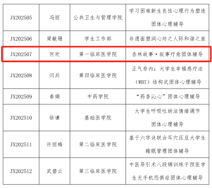 近日,广州中医药大学第六批“岐黄健心计划”团体心理辅导项目立项名单正式公布,全校共12个项目脱颖而出,每项获4000元资助。其中,第一临床医学院辅导员何欢老师主持的《杏林故事·叙事疗愈团体辅导》成功入选(项目编号:JX202507),彰显学院心理健康教育创新与实践的卓越成效。