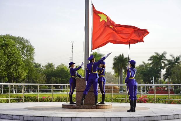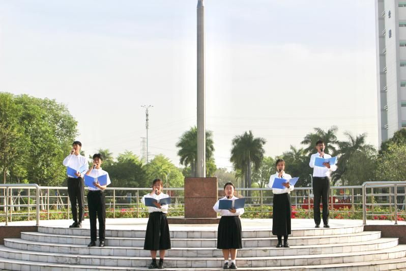 7点20分,升旗仪式正式开始。英姿飒爽的国旗护卫队迈着稳健有力的步伐,护卫着鲜艳的五星红旗走向升旗台。在激昂雄壮的国歌声中,五星红旗冉冉升起,迎风飘扬。全体师生庄严肃立,面向国旗行注目礼,齐声高唱国歌,歌声嘹亮,响彻广场,歌声中饱含着对伟大祖国的无限热爱与崇高敬意。