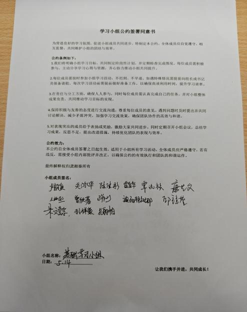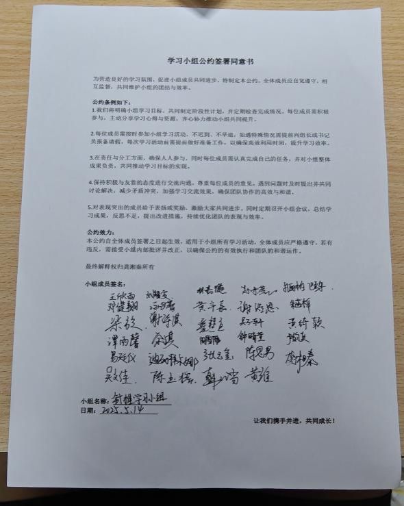 会议最后是学习小组公约同意书签署。全体成员签署学习小组公约,承诺遵守小组纪律,积极参与各项学习活动,以实际行动为学习小组的良好发展贡献力量。