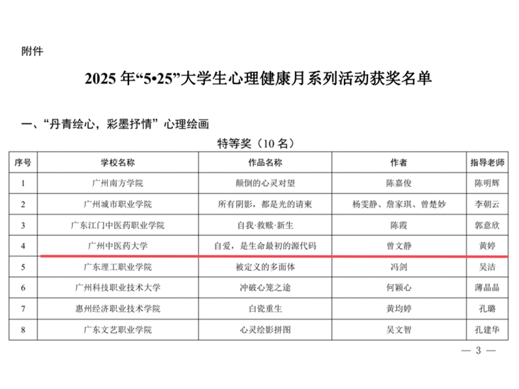 2025年10月,为增强大学生心理健康意识,推动高校心理健康教育内容与形式创新,广东省教育厅举办了2025年“5•25”大学生心理健康月系列活动。本活动包括心理绘画、心理情景剧、心理健康主题演讲、心理科普短视频及心理微课等5个项目组成,经组织专家评审后从上述项目中各评出特等奖10名,一等奖20名,二等奖30名,优秀组织奖3名。全省高校师生踊跃参与,积极营造健康和谐的校园氛围,涌现出一大批优秀活动成果。