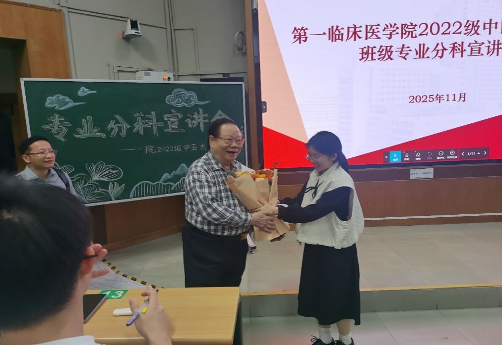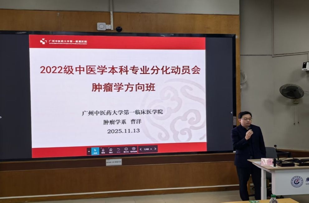 秋意渐浓,学途新启。2025年11月13日晚,第一临床医学院2022级中医学五年制专业分科宣讲会于三元里校区办公楼第一大课室隆重举行。本次会议特邀国医大师周岱翰教授权威坐镇,汇聚各学科方向专家:肿瘤学系曹洋教授、肖志伟副教授、陈尧老师、王文萍老师;妇儿学系郜洁教授、黄艳茜老师;中医经典临床学系刘树林教授;骨伤科学系赵京涛教授;教育教学部龙泳伶部长、周峰副部长、陈小波副主任、谢翠英老师等。众师者齐聚一堂,以深厚学识与临床经验为学子指点迷津,共同开启中医传承与创新的新篇章。