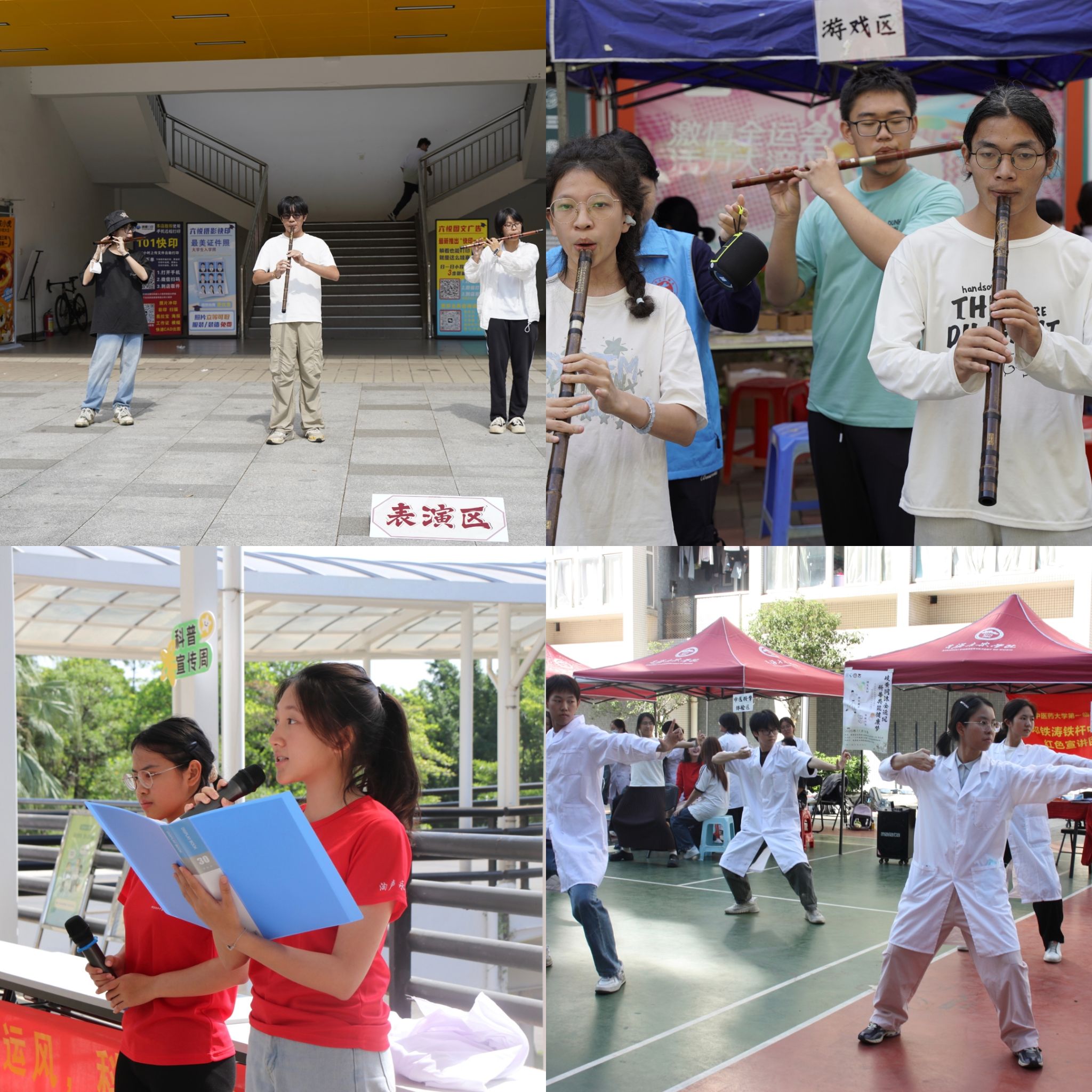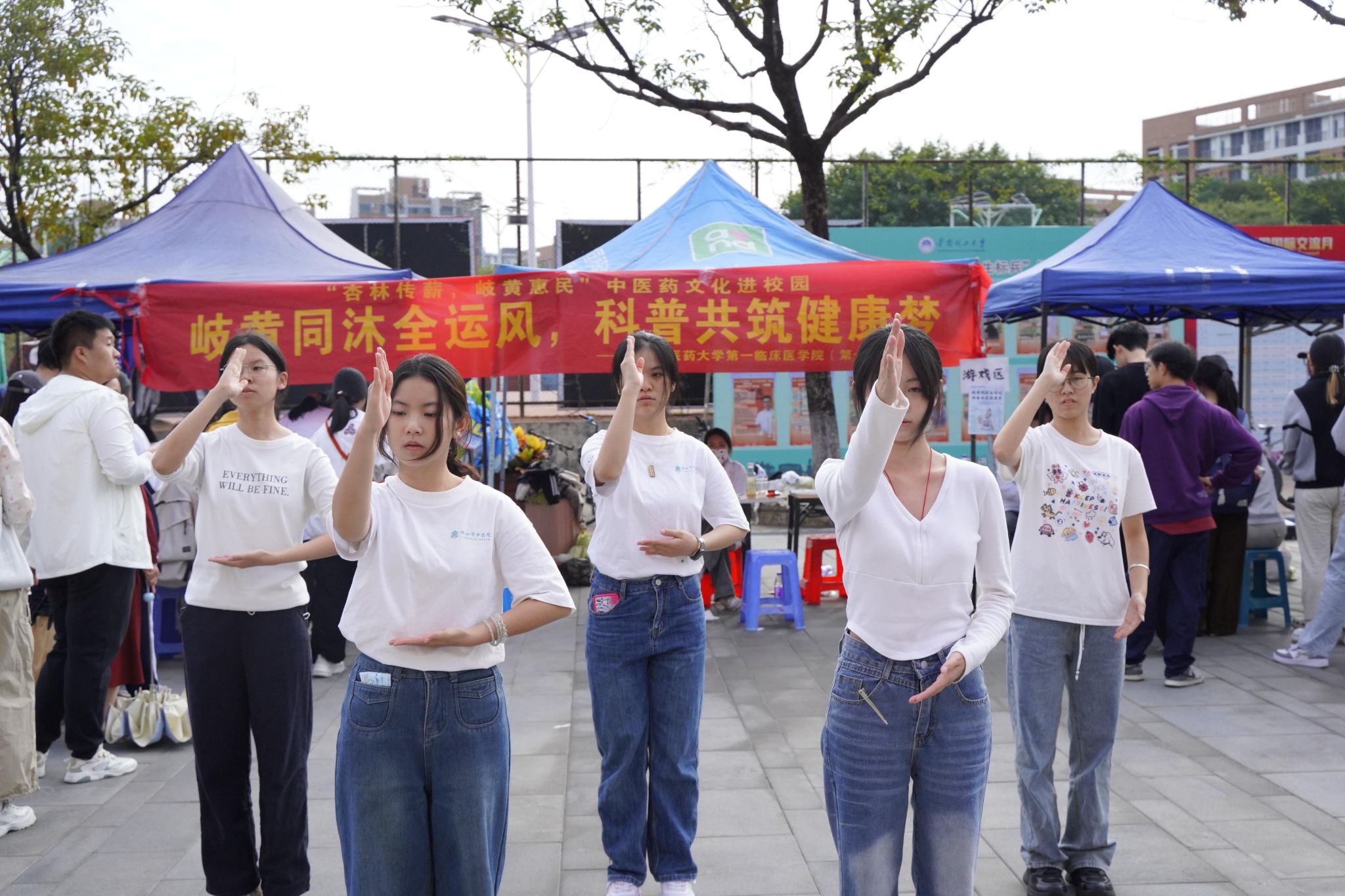各高校志愿者队伍打造特色活动分区,为参与者带来多元体验。雅韵传承,融文化于身心。笛箫社演奏传统曲目与现代作品《大鱼》,让参与者沉浸式感受民乐与中医药文化交融之美。邓铁涛铁杆中医红色宣讲团讲述国医大师邓铁涛的行医治学故事,传递中医传承的温度与坚守;古典乐伴奏的八段锦体验,更让学子在舒展肢体中实现文化浸润与身心调养的双重收获。