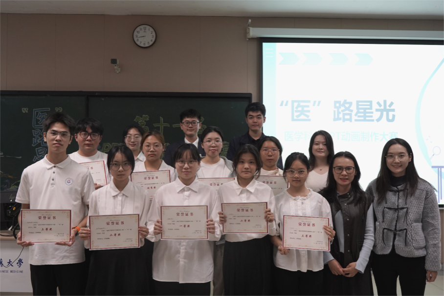 紧接着,何诗诗老师对本届决赛进行总结陈词。何诗诗老师充分肯定了本次活动“医”路星光的主题,对整场活动给予了高度评价。她对参赛选手在内容策划、动画呈现与现场讲解中的出色表现进行简短的总结点评,赞扬他们以青年视角和创新形式,将专业的医学知识转化为生动易懂的科普作品。同时,她也对同学们积极投入、热情参与的态度表示认可,并鼓励大家继续保有这份传播健康的责任感,在今后的学习与实践中,主动成为医学科普的倡导者,向社会传递更多科学、准确、正向的健康知识,让医学星光长明。最后,主持人宣布获奖名单。在全场掌声中,获奖队伍依次上台领取奖品。