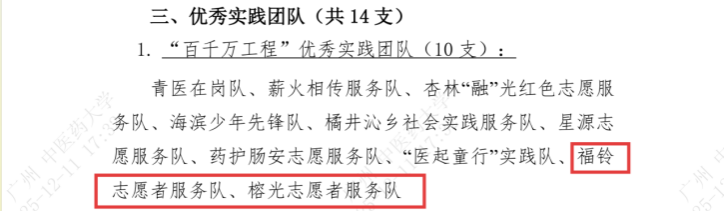 本学年,我院16支“百千万工程突击队”分赴各地,深入乡村一线,发挥专业优势与创新活力,在医疗服务、义教、中医药文化宣讲、科技助农、党史宣讲等领域取得丰硕成果。其中,我院福铃志愿者服务队与榕光志愿者服务队,表现卓越,成果显著,荣获校级“百千万工程”优秀实践团队称号。
