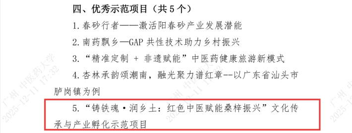 邓铁涛铁杆中医红色传承队连续三年深耕邓老故乡——开平市月山镇,致力于塑造“铁杆中医”文化IP。团队主导的项目“铸铁魂·润乡土:红色中医赋能桑梓振兴”文化传承与产业孵化示范项目,荣获校级“示范项目”荣誉称号。