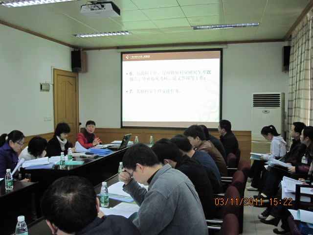 会议着重介绍了科室研究生秘书的职责及阶段任务,明确研究生临床轮训期间有关管理规定;结合2010年医院科室目标管理研究生培养绩效评价结果,分析总结研究生培养管理中存在的问题;与会人员就研究生考勤管理、人员合理安排、临床教学活动的开展及研究生值班等问题,提出了许多宝贵的意见和建议。接着,脑病科、儿科、三骨科、肛肠科的刘叶、罗菲、曾建春、赵永昌等老师就本科室定期开展的学术沙龙、英语学术报告、学术论坛等专业研究生学术活动进行了交流和分享。最后,办公室申啸笑老师对今年毕业临床技能考核工作进行了布置,明确考核要求、程序及工作进程等。