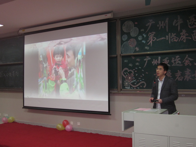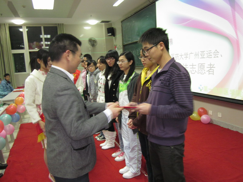 大会开始,志愿者工作负责人崔若如做了工作总结汇报,她总结了自广州亚运会志愿者工作以来,第一临床医学院积极配合学校开展的各项工作。接着叶升鑑书记宣读《关于表彰广州中医药大学第一临床医学广州亚(残)运会志愿服务先进集体和个人的通知》,并对广州亚运会、亚残运会志愿者工作先进个人、志愿者标兵进行颁奖。志愿者代表黄晓其老师还与大家分享了一段记录志愿者工作酸甜苦辣的视频。一位备受感动的同学上台深情地给黄老师献上了一束鲜花。