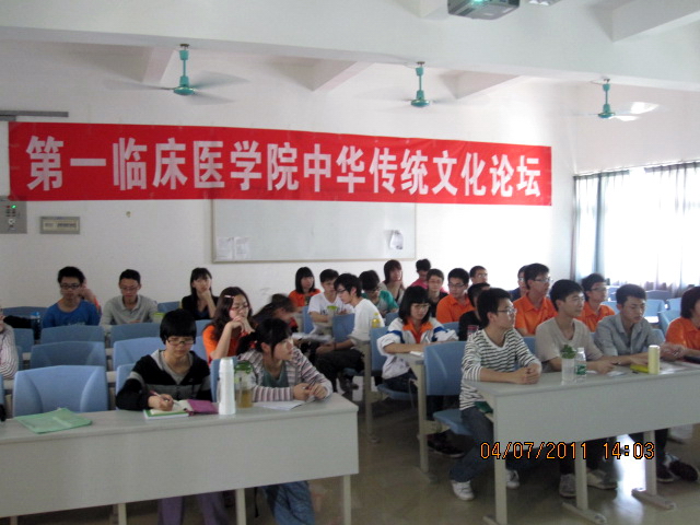 【一院讯】第一临床医学院2011年度中华传统文化论坛(第一讲)于2011年4月7日下午2:00在大学城校区A509课室隆重召开。学校中医养生学博士生导师,党委孙晓生副书记应邀为2010级中医学专业实验班(国家理科基地班)作了一场题为《古风雅韵 百草欣欣——< 诗经>本草与现代养生》的专题讲座。