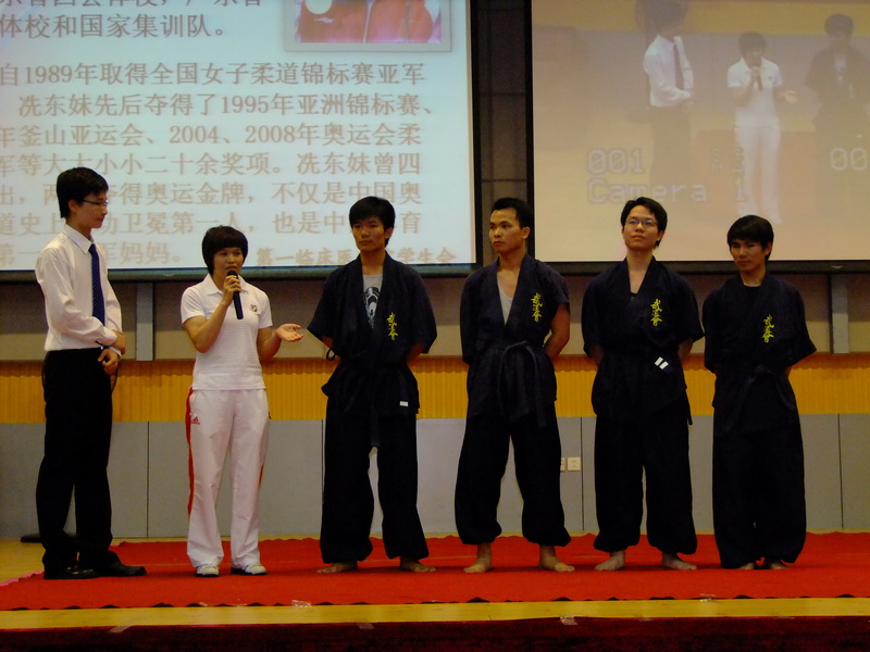 论坛的第一部分是一段现场柔道表演,表演者是广东水利电力职业技术学院柔道协会的4位队员。精彩的表演不时赢来观众的阵阵欢呼声,表演结束后,冼东妹与4位同学亲切握手并对他们的表演进行了专业的点评。