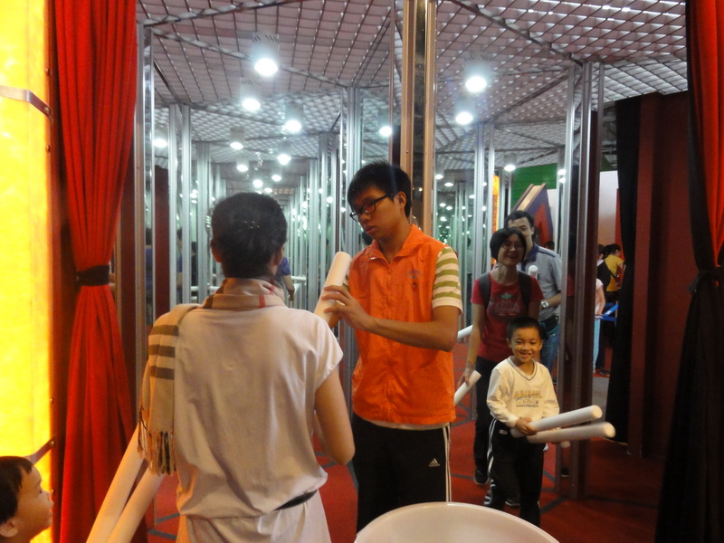 9点左右,全部人员到了各自的岗位,简单的培训之后,便开始上岗服务:同学们有的位于“绿色家园馆”的台风体验专区,组织游客有秩序的进入“体验小屋”,分发防护眼镜,保证大家安全顺利地体验1至10级台风;有的位于“飞天之梦馆”的电动转椅体验区,帮助游客系紧安全带,操控转椅,使转椅旋转并左右倾斜,感受航天员的训练过程;有的位于影院,主要维护现场秩序…… 大家各司其职,微笑服务。