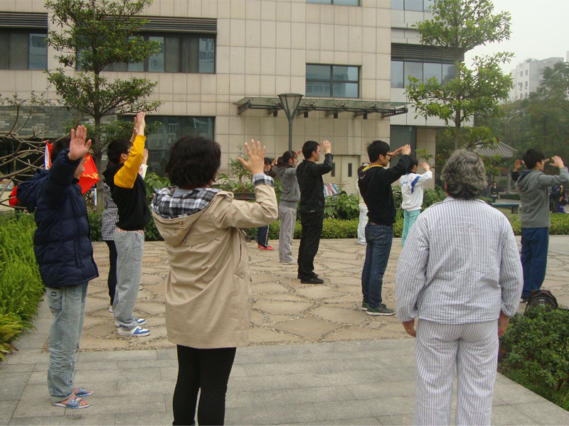 2012年3月3日15点,09中西医团支部的同学们在附院花园向周围群众和就医的病患展示、教习了养生健身操——八段锦,受到群众欢迎。