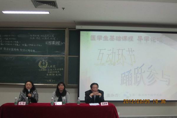 【一院讯】2012年3月5日晚19:00,我院有幸邀请到基础医学院邝枣园教授、王黎教授以及中药学院蓝森麟教授莅临大学城校区综合楼102室,与在场学生共聚“医学生学习素质教育之医学生基础课程导学论坛”的面对面交流平台,畅谈医学生基础课程学习方法。
