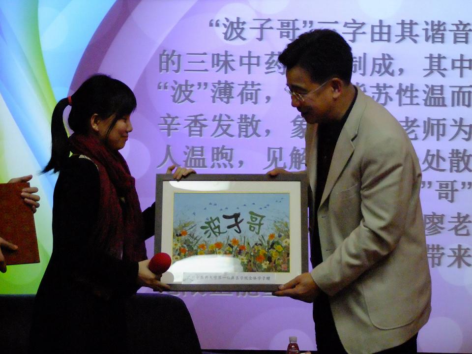 论坛结束后,廖厅长收到一份由同学们赠送的别出心裁的礼物,一幅用中药压花制成的写着“波子哥”三个字的牌匾。