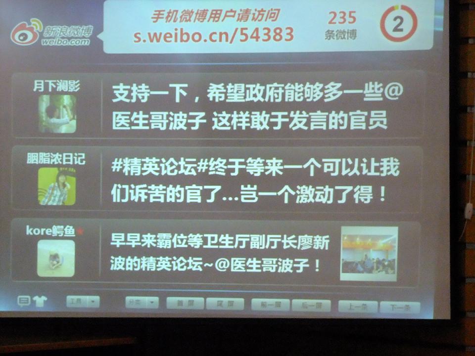 廖新波,现任广东省卫生厅副厅长,广州中医药大学客座教授,2006年涉足博客,是我国最早开博的厅级干部之一,外界称其为“博客厅长”;他经常在微博上直言对热点问题的看法,游走于体制内外为百姓解答疑惑,粉丝都称他为“波子哥”,一院的同学正是通过微博邀请他来到了一院的精英论坛。