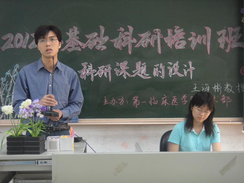 2012年4月22日上午8点30,第一临床医学院第五届基础科研培训班在大学城教学楼A201正式开班,第一节课由我校第一附属医院骨科王海彬教授主讲,主题为“科研课题的设计”。一院学工办主任钟天送、11级辅导员陈文桂莅临现场。