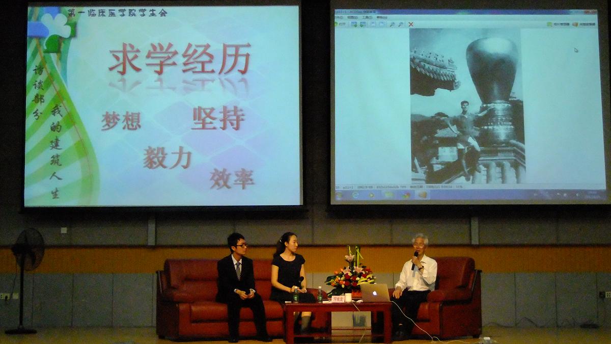 2012年4月25日晚19时,大学城校区国际会议厅挤满了学生,他们翘首以盼的是一位古稀之年的学者——上海世博会中国馆的总设计师、中国工程院院士、建筑学家何镜堂。这是第一临床医学院第六届“精英论坛”第二讲“对话中国馆之父”的现场,来自校内外四百多名学生共聚一堂,聆听74岁高龄的何镜堂院士讲述他的建筑梦,他那曲折而幸运、艰苦并快乐的建筑人生。一院教学处处长方熙茹、团委副书记邱敏、学生工作办公室全体老师也莅临现场。