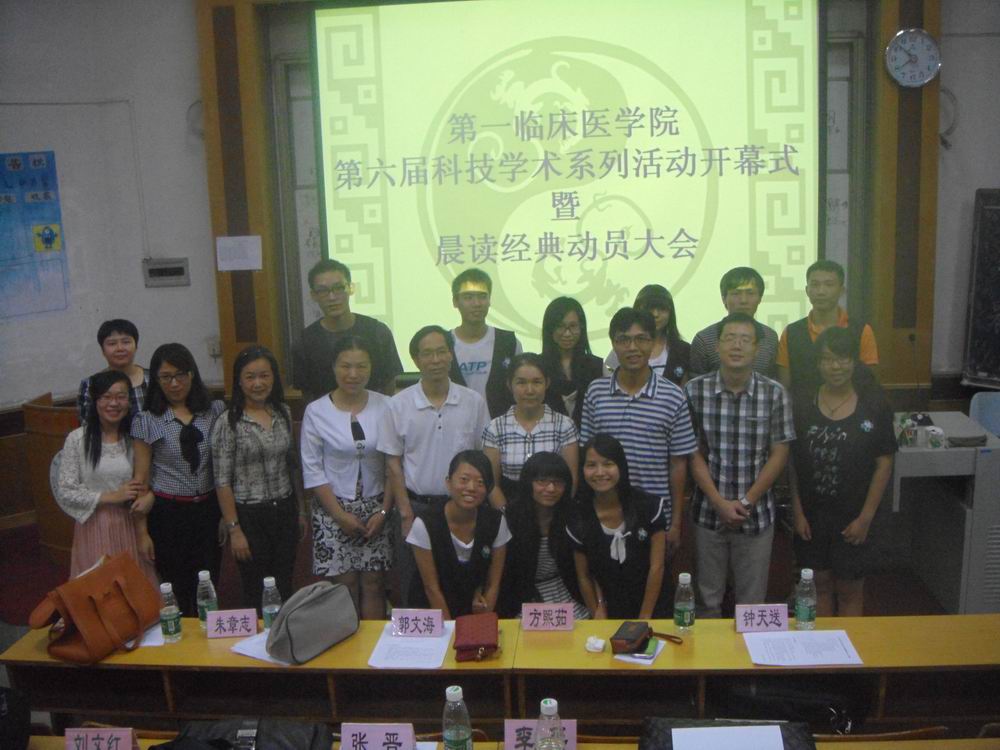 2012年10月9日19:00,第一临床医学院第六届学生科技学术系列活动开幕式暨“晨读经典,奠基临床”动员大会在我校三元里校区办公楼第一课室隆重举行。第一临床医学院党委郭文海副书记、教学处方熙茹处长、第一附属医院内分泌科主任朱章志教授、学工办钟天送主任、学院团委邱敏副书记以及部分学工办老师参加了动员大会。