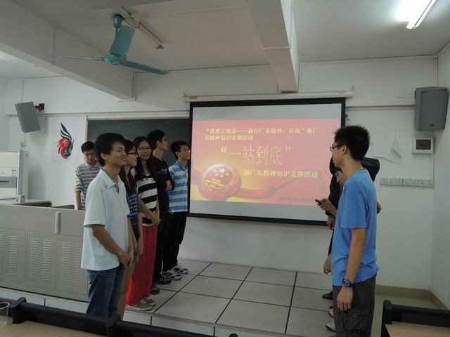 为更好的阐释新广东精神的深长意味,让同学们以身作则,发扬精神,我班组织了“一站到底”新广东精神知识竞赛。10月24日,一院09七班里座无虚席,“硝烟”不断,参加竞赛的同学为保住自己的“站神”荣誉,接受各方的挑战,展现出自己对新广东精神的深刻认识。座下的同学时时报以热烈的掌声,为睿智多谋的同学喝彩。
