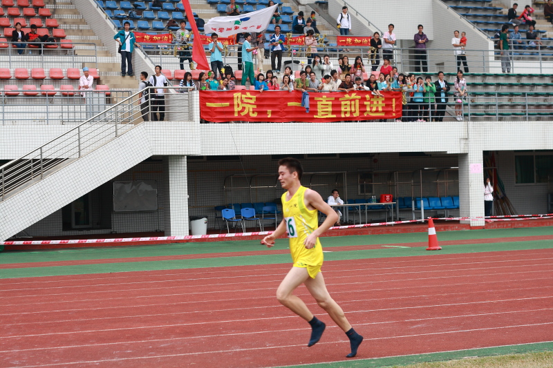15日下午男子1500米和16日上午的男子5000米比赛中,我院运动员12级研究生唐宏宇均获得第一名。据悉,在5000米后段比赛中,唐宏宇因钉鞋途中损坏,只好脱掉钉鞋赤脚坚持比赛,为此脚部受伤,在接受采访时他说道:“参加校运会只是抱着玩的心态,平时我也会积极参加运动。作为一个医生,一个好的身体是必须的。”