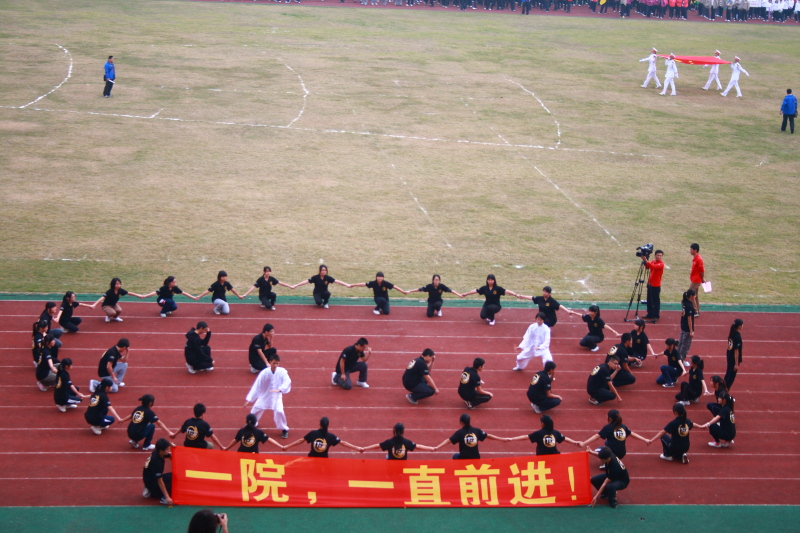 15日上午8点,在开幕式上我院学生方队以太极两仪队形展现在朱红的跑道上,引起一阵雷鸣般的掌声,观众席上的人纷纷站起来看个究竟,响亮的口号更是震耳欲聋。