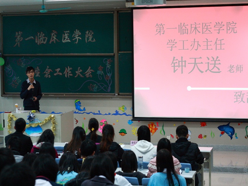 会议的最后,第一临床医学院学工办主任钟天送老师表示了自己对新一届学生会成员的赞许,也提出期望。他希望新一届干部能继承传统,推陈出新,站着前任干部的肩膀上看到更辽阔的天空,办出更好的活动;希望干事们能加强合作,加强沟通;也希望干事们无论在学习还是工作中都能严格要求自己。最后,钟主任还在期望中做出了对一院未来的展望。