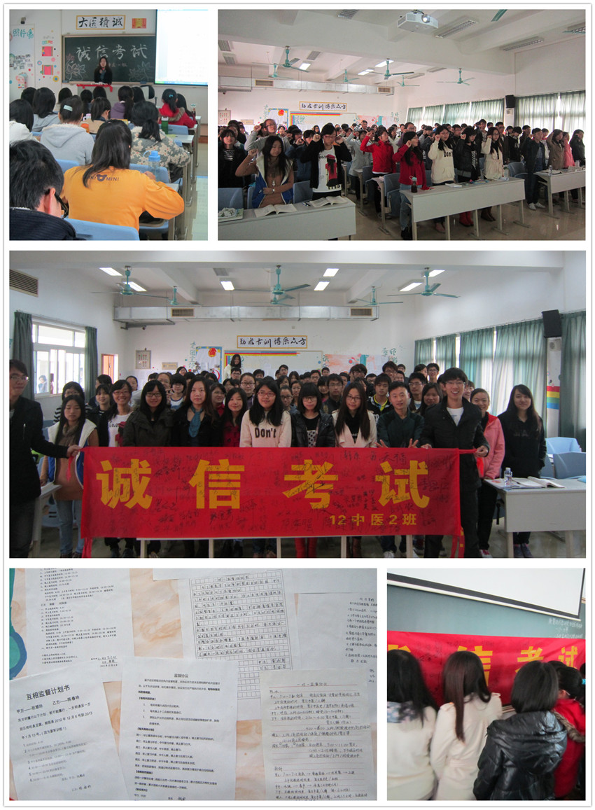 【一院讯】2012年12月13日9点30分,教学楼A 502课室传来铿锵有力的宣誓声,一院12级中医2班自发地开展了一场诚信考试宣誓会,年级辅导员池思晓老师作为见证人出席了本次宣誓会。本次宣誓会以“生命的本质从真实开始,人格的尊严从诚信起步”为主题,旨在通过宣誓仪式进一步强化同学们的诚信意识,让同学们认识到考试作弊的严重性,让同学们为诚信考试做出承诺,营造一个公平公正的竞争环境,从而真正树立良好的学风和班风。