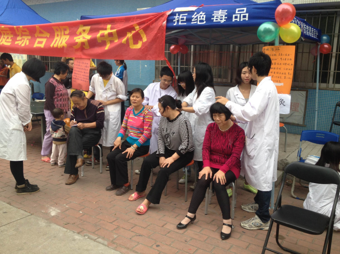 前期宣传充分,活动一开始就有许多老人家带着小孩前来,我们的推拿、艾灸小组一下子就忙得不可开交。志愿者们针对小区人群特点,特意设置的儿童题目游戏,也吸引了孩子们的注意力。场面非常热闹!
