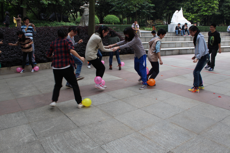 一轮啫喱大战和休息过后,大家又抱着高涨的热情进入更加激烈的“踩气球”环节。这一次,是三个人为一组而且每个人脚踝两旁各绑上一个气球。在划好的正方形区域内,每次四组队伍,而每支队伍的目标是将非同组的气球踩爆!最后仍剩余气球的队伍为胜利者。“嘣!嘣!嘣”声声弥漫着整个广场。其中夹杂着欢呼声,尖叫声,还带有商量作战形式的窸窣声。如果说正方形内是音乐盒里一个个跳跃的音符,那么正方形外就像观看演唱会的影迷潮。在这里,不仅有团结的号召,也有智慧的沉淀。大家玩得既有技术又有激情,不知不觉中引来了一群有一群驻足观看的路人。其声势之浩大,也算是一个美丽的意外收获!