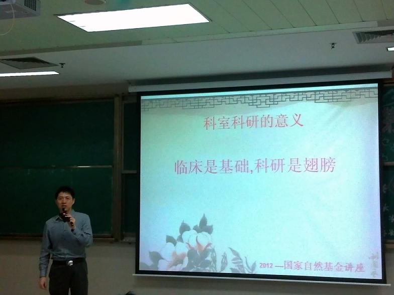 接下来则是由一附院的王海彬教授带来的《走进科研》主题讲座,王海彬教授科的语言风趣幽默,从我们与北大清华学生的区别这个问题开始了他精彩的演讲,他告诉我们若想成为一个成功的人士,就要“拉着成功人士的衣角跟他走”,同时,直接明了的指出——“临床是基础,科研是翅膀”,告诉我们科研就是创新,然后向我们浅谈了科研的意义及目的、科研的流程、基本内容及前沿课题、如何选题及创新、科研资料收集的方法及平台,王海彬教授科风趣幽默的语言赢得满堂掌声。在接下来的现场问答环节中,同学们就科研方面的疑惑进行踊跃的提问,王海彬教授为同学们一一耐心的解答,使同学们对科研又有了进一步的认识。