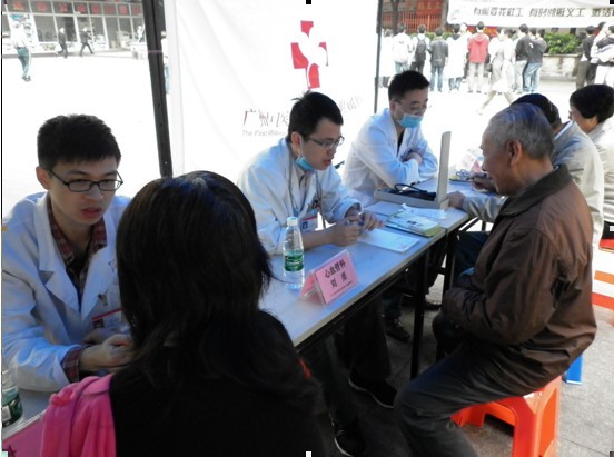 8点10分,我们准时到达目的地。同学们在白云街家庭服务中心社工李SIR的带领下,匆忙地开始了准备工作:包括搬抬桌椅、贴横幅、摆桌椅、准备义诊的工具等。本次义诊的项目包括:贴耳穴、推拿按摩、艾灸、春季花茶养生和保健、拔火罐、派发宣传单(宣传单分两种,分别是关于H7N9的知识和医学养生知识)、派发问卷、健康知识咨询。这次义诊有来自一附院的4位医生助阵,他们分别来自心血管科、针灸科、骨科、脾胃科。同时,李平老师也牺牲自己的假日时间前来给我们的活动进行指导。