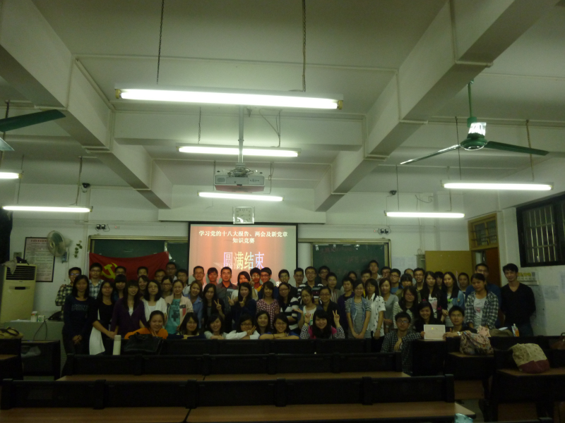 为进一步激发全体党员学习十八大、两会及新党章知识的积极性,保持党员先进性,提高党员的政治修养和综合素养,丰富党员的校园文化生活,2008本科中西医党支部于2013年4月26日在三元里校区新课室楼103举行“学习党的十八大报告、2013年两会及新党章知识竞赛”。参加本次活动的有年级辅导员黄晓其老师,2008本科中西医党支部全体党员及2008本科中医党支部在附院实习党员代表。