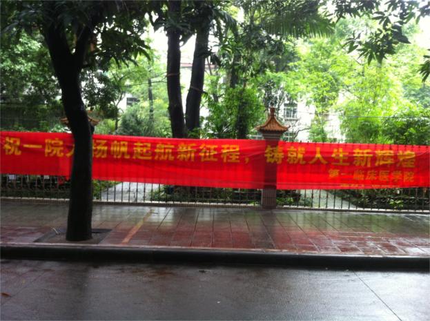 5月10日上午7点,芒果路上已经堆满了大大小小许多行李,同学们仍在挥汗如雨地从宿舍楼上往下搬行李。“预祝师兄师姐教学实习学有所成”、“祝一院人扬帆起航新征程 铸就人生新辉煌”,芒果路上的横幅赫然在目。这是一年一度的教学实习启程的日子,一院2010级本科及09七年制共计482名同学,今天将奔赴省内21家医院,完成为期三个月的教学实习任务,这也是他们期待已久的一次身临其境的临床学习机会。