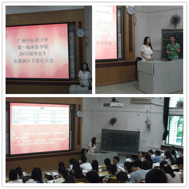 【一院讯】2013年6月24日上午10:00,第一临床医学院毕业生文明离校活动之贷款毕业生诚信、励志教育大会在三元里校区第一大课室举行。学院奖助贷工作负责老师池思晓老师、2008级本科毕业班辅导员黄晓其老师以及2013届80多名贷款毕业生参加了本次大会。